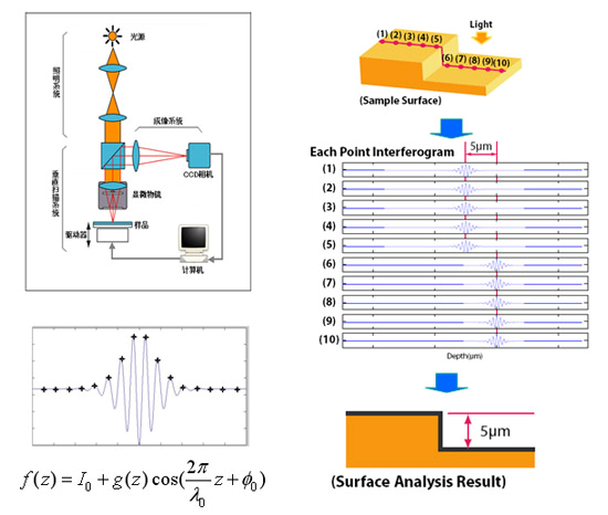 白光干涉三維形貌儀是利用光學(xué)干涉原理研制開發(fā)的超精密表面輪廓測(cè)量?jī)x器。照明光束經(jīng)半反半透分光鏡分成兩束光,分別投射到樣品表面和參考鏡表面。從兩個(gè)表面反射的兩束光再次通過分光鏡后合成一束光,并由成像系統(tǒng)在CCD相機(jī)感光面形成兩個(gè)疊加的像。由于兩束光相互干涉,在CCD相機(jī)感光面會(huì)觀察到明暗相間的干涉條紋。干涉條紋的亮度取決于兩束光的光程差,根據(jù)白光干涉條紋明暗度以及干涉條文出現(xiàn)的位置解析出被測(cè)樣品的相對(duì)高度。